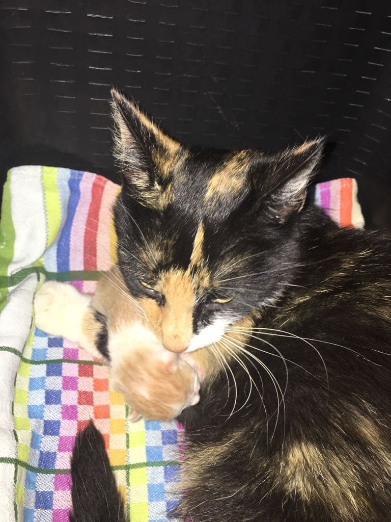 Tijdens haar bevalling werd ze gestoord door de hond, volledig gestresst en in paniek is ze tijdens haar bevalling gevlucht in het stro en gevonden met 1 overgebleven kitten.